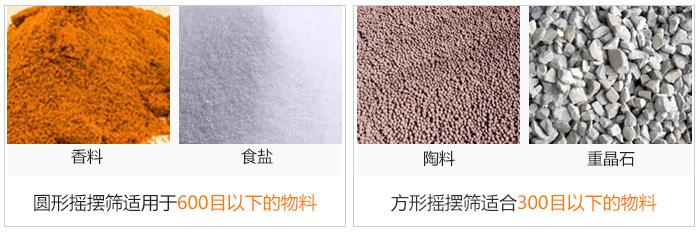 圓形搖擺篩適用于輸送600目以下的物料,如(香料、糖鹽等),單位之間內方形搖擺篩比圓形搖擺篩篩分量大。方形搖擺篩比圓形搖擺篩篩分精度低,方形搖擺篩適合輸送300目以下的物料,如(陶料、重晶石等)。