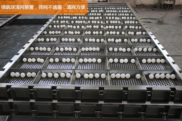2、裝有彈跳球清網(wǎng)裝置,此清網(wǎng)形式系統(tǒng)通過布設在篩網(wǎng)下、托球板上面的高性能彈跳球不規(guī)則的擊打篩網(wǎng),靠二次諧振完成清網(wǎng)防堵,其內(nèi)部結(jié)構(gòu)如圖4所示。此結(jié)構(gòu)簡單易行、效果顯著,適用于大多數(shù)篩分作業(yè)的清網(wǎng)和防堵。